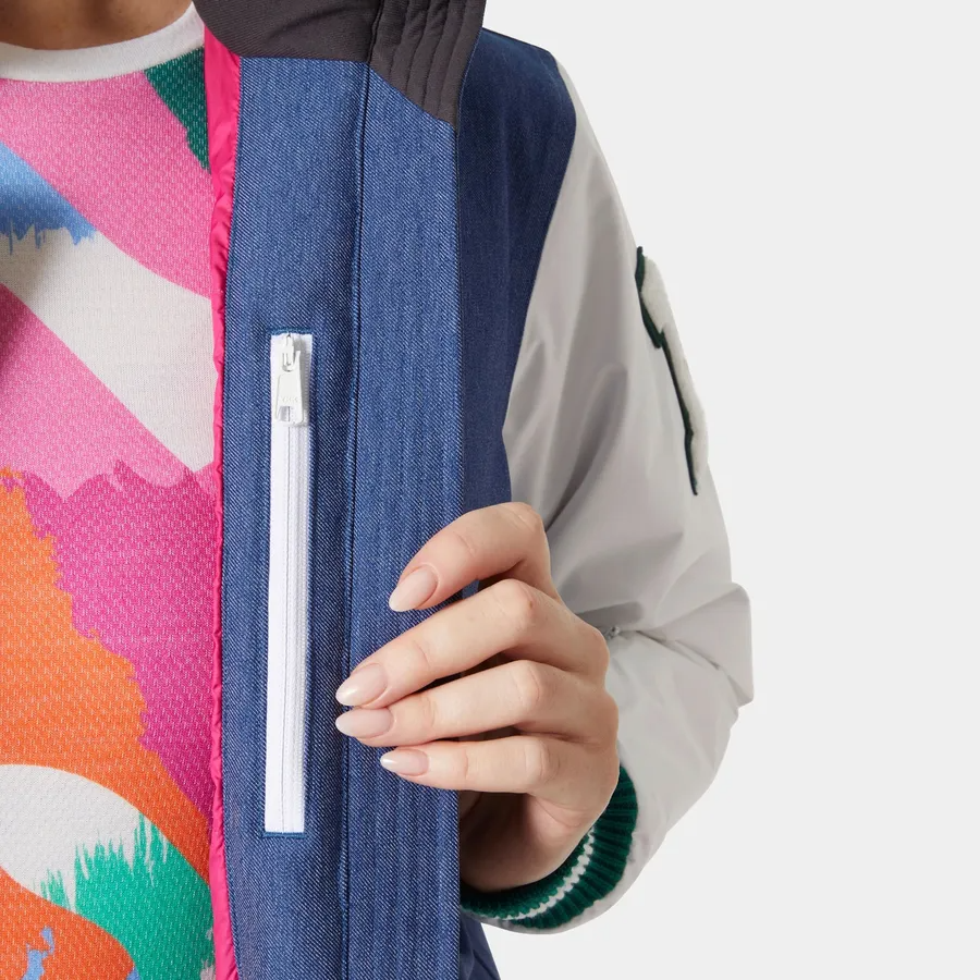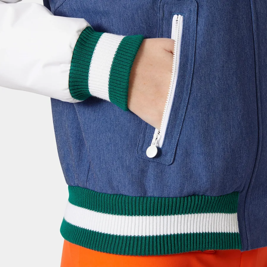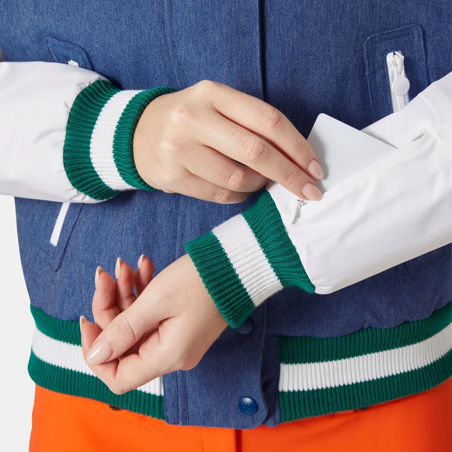 Based on Helly Hansen iconic 90s designs, we’ve created the Women's Après Ski Varsity Jacket: a fully functional ski jacket with a playful aesthetic. Built with our HELLY TECH® Protection technology, it’s designed for downhill skiing in stable to light snowy conditions as well as resort life. Key features include blowable synthetic insulation, a quilted lining, a powder skirt, and a pocket for your ski pass. This jacket offers warmth with a retro aesthetic, so you can stay comfortable both on the groomers and at the parties at the bottom of the hill.